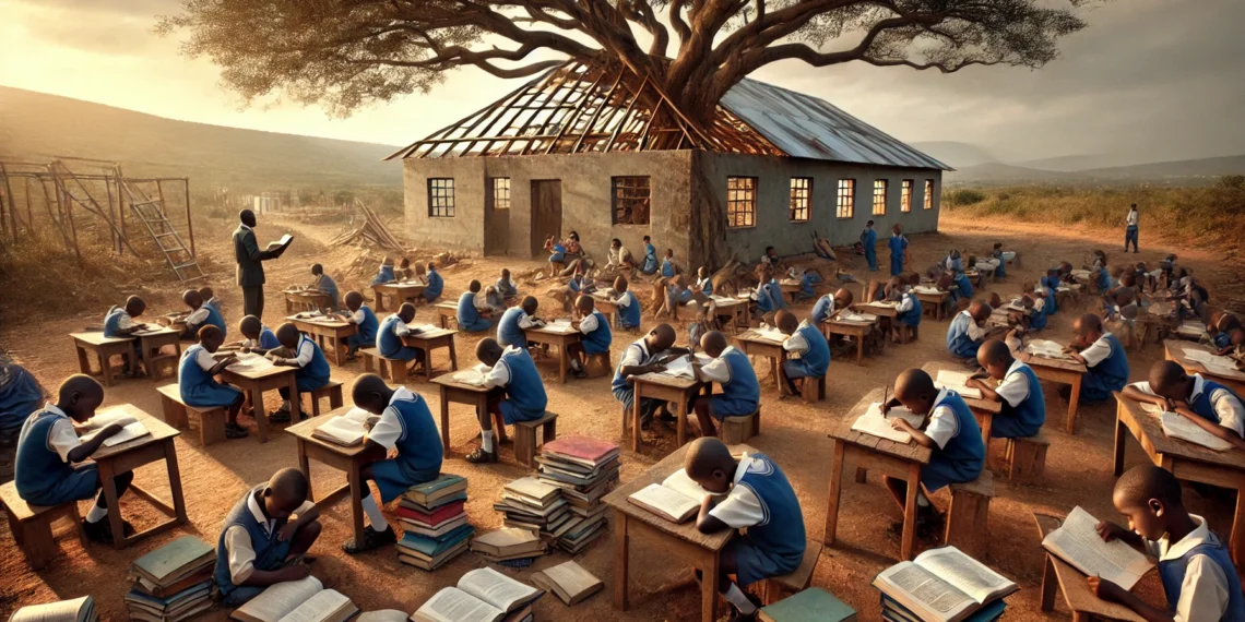 A rural South African school setting with learners studying under a tree due to a lack of classrooms,