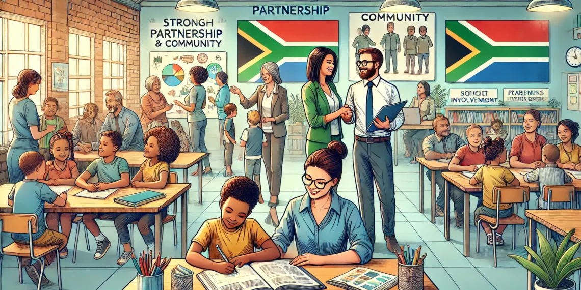 A scene showing South African parents and teachers collaborating in a vibrant school setting.