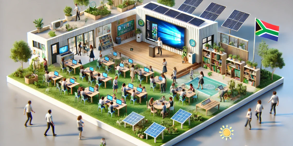 A modern South African school with diverse students and teachers interacting in a collaborative environment.